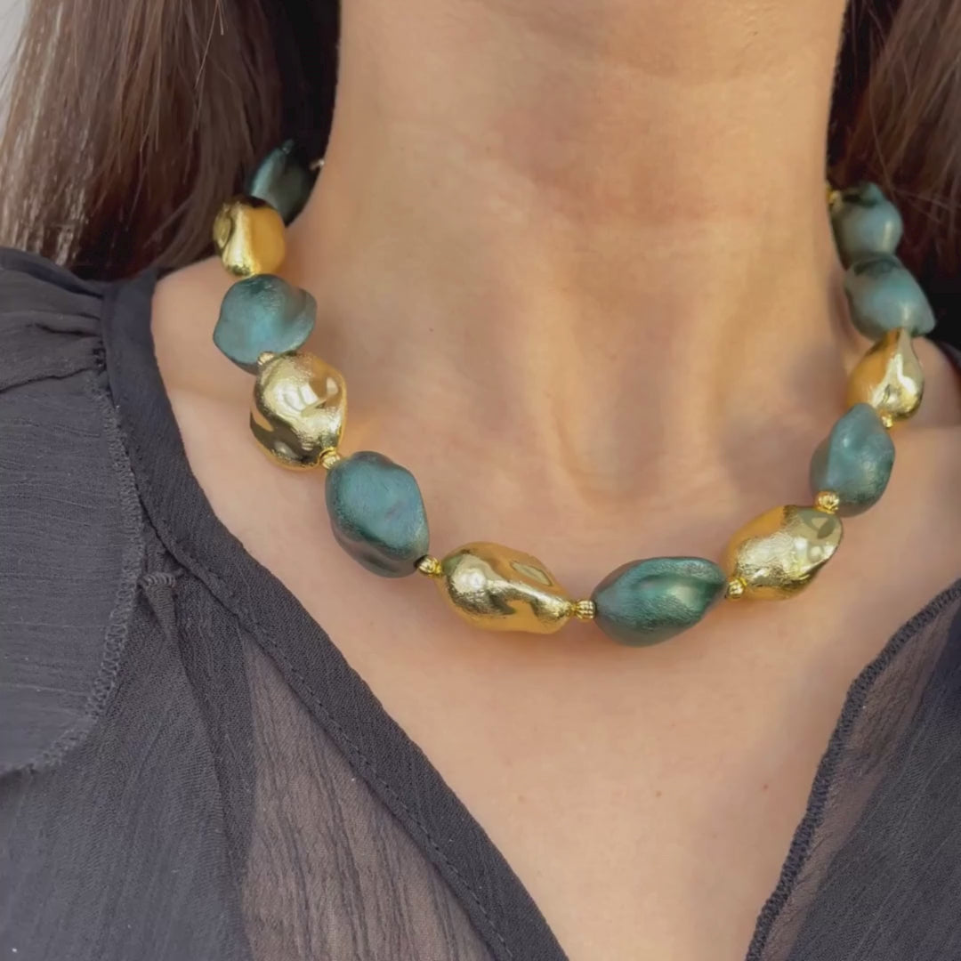 El collar “Luz de Jade” combina el magnetismo del verde profundo con reflejos dorados que aportan calidez y sofisticación.