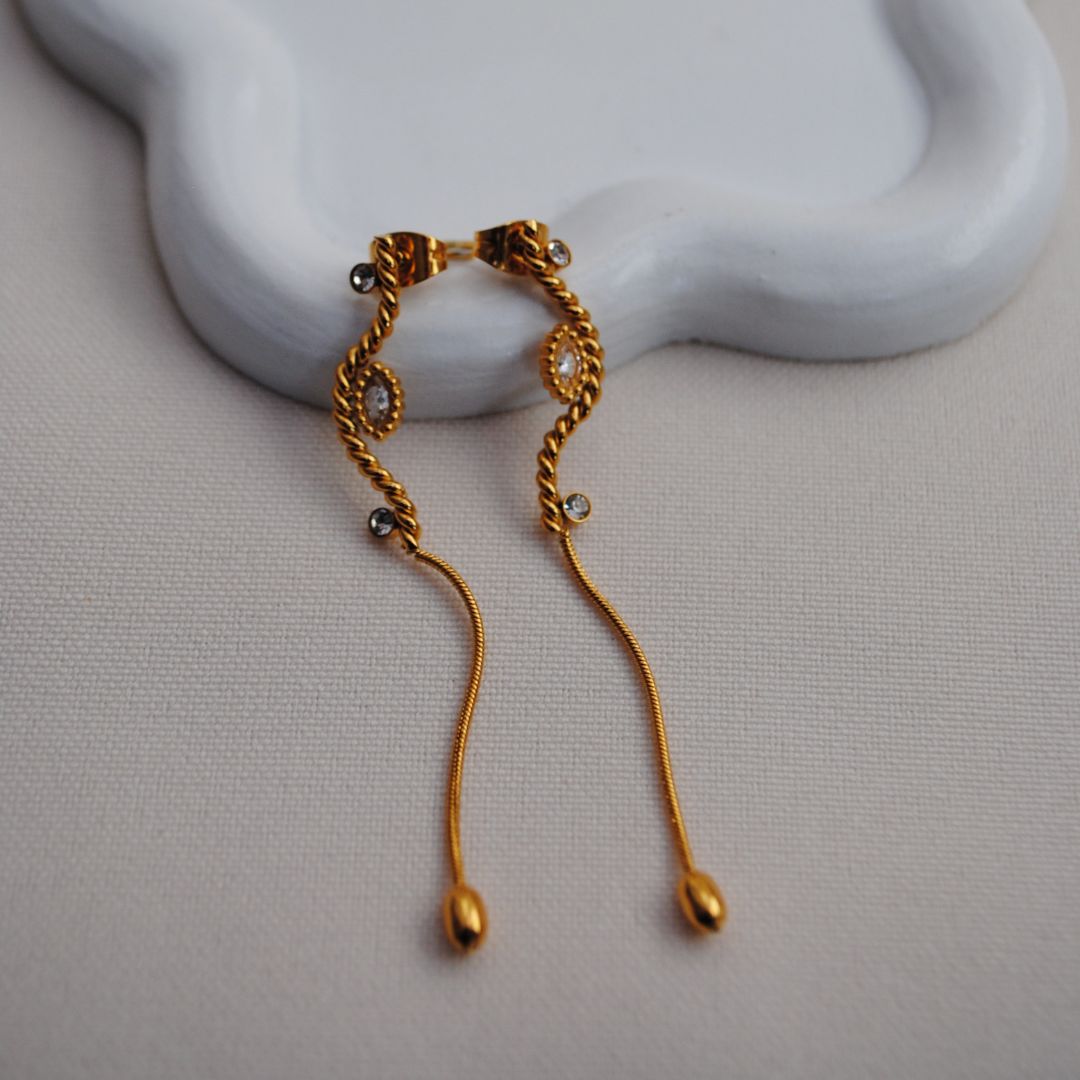 Fabricados en acero inoxidable dorado con pequeños brillos de circonitas, su diseño combina una parte trenzada superior con dos finos hilos que aportan ligereza y fluidez.