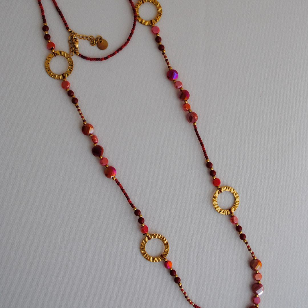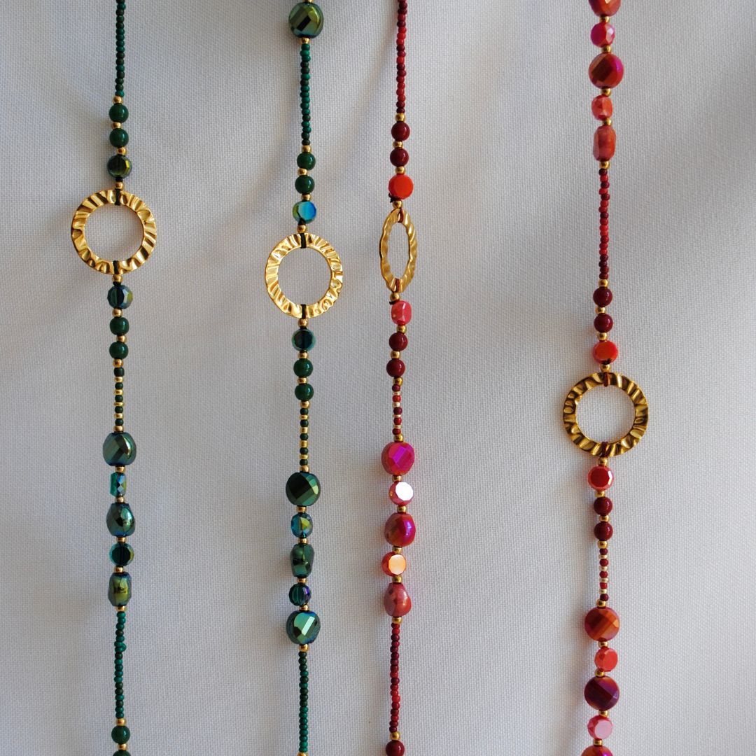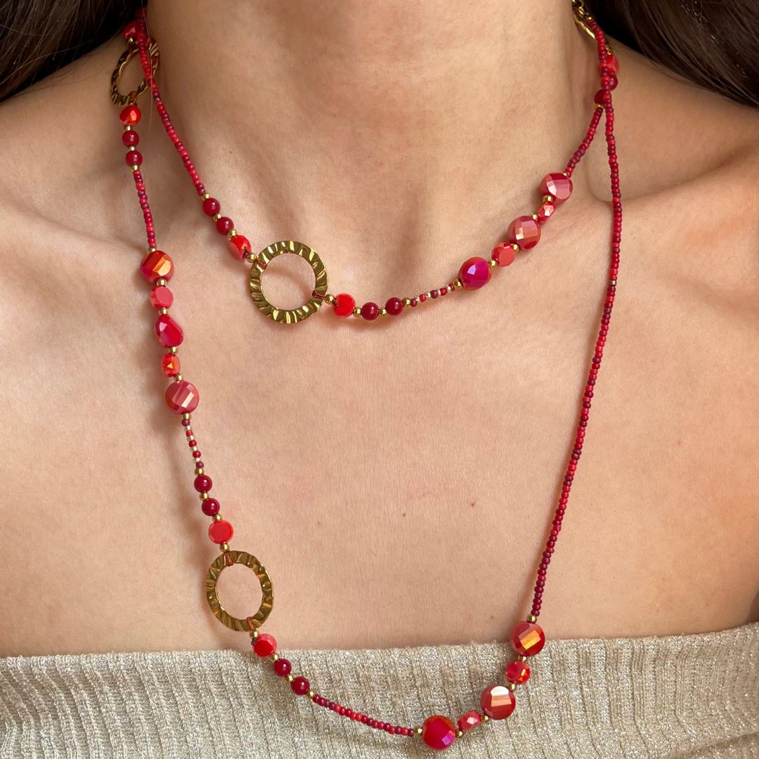 Ilumine o seu look com o Colar Soleil, uma peça longa e leve que combina contas vermelhas e verdes com acabamentos em aço inoxidável. O seu design ajustável de 90 cm + 5 cm torna-o o acessório ideal para complementar vestidos, camisas ou blusas de verão.