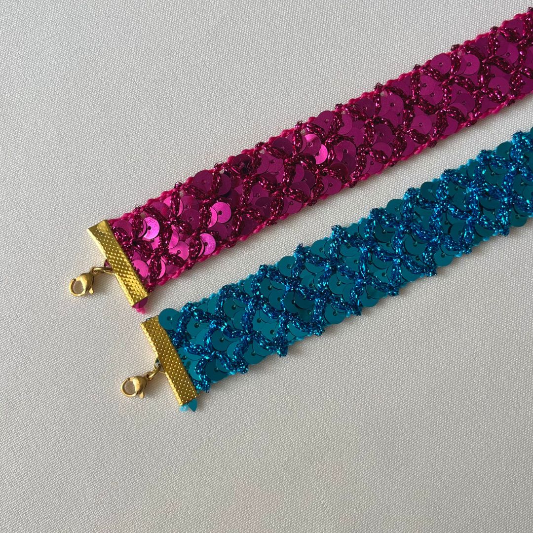 - Material: têxtil com três fiadas de lantejoulas + latão + aço inoxidável