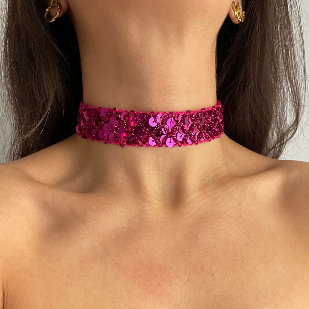 Acrescente brilho à Gargantilha com brilho fúcsia, um acessório criado para se destacar com um toque subtil e elegante. Feito à mão sobre uma base têxtil, este colar de 2 cm de largura apresenta três fileiras de lantejoulas que captam a luz e acrescentam um brilho vibrante a qualquer look.
