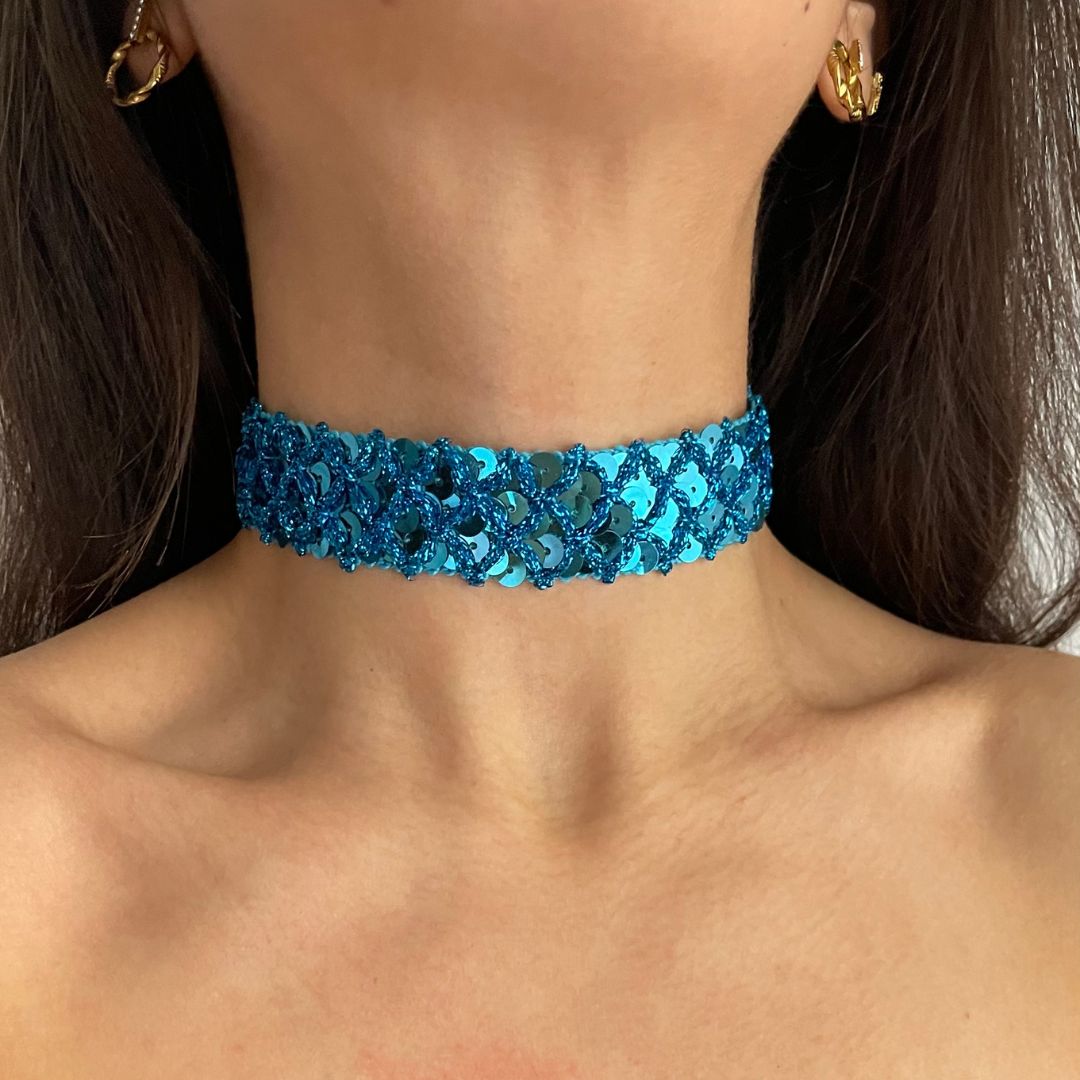 Acrescente brilho ao gargantilha turquesa brilhante, um acessório criado para se destacar com um toque subtil e elegante. Feito à mão sobre uma base têxtil, este colar de 2 cm de largura apresenta três fileiras de lantejoulas que captam a luz e acrescentam um brilho vibrante a qualquer look.
