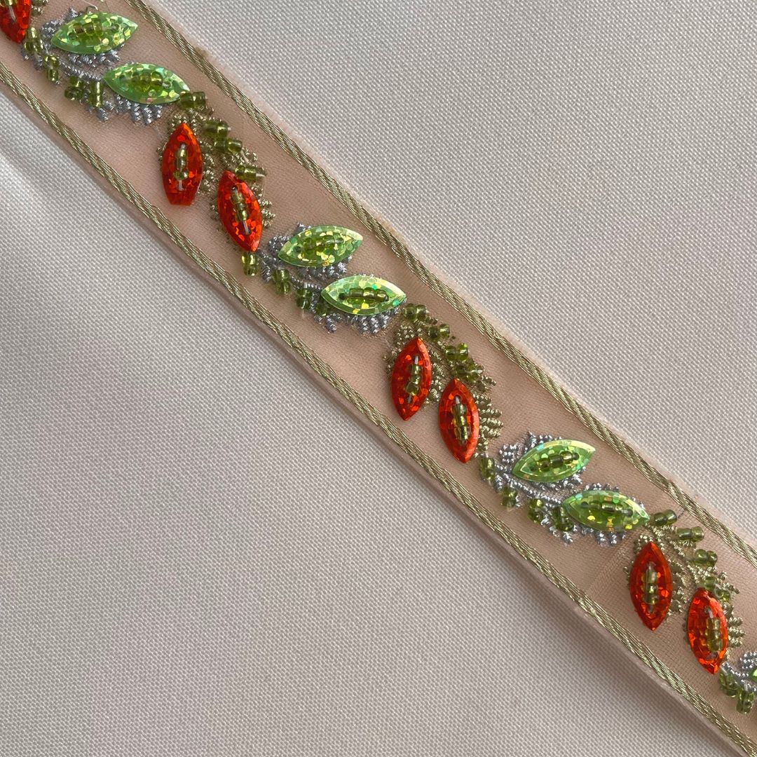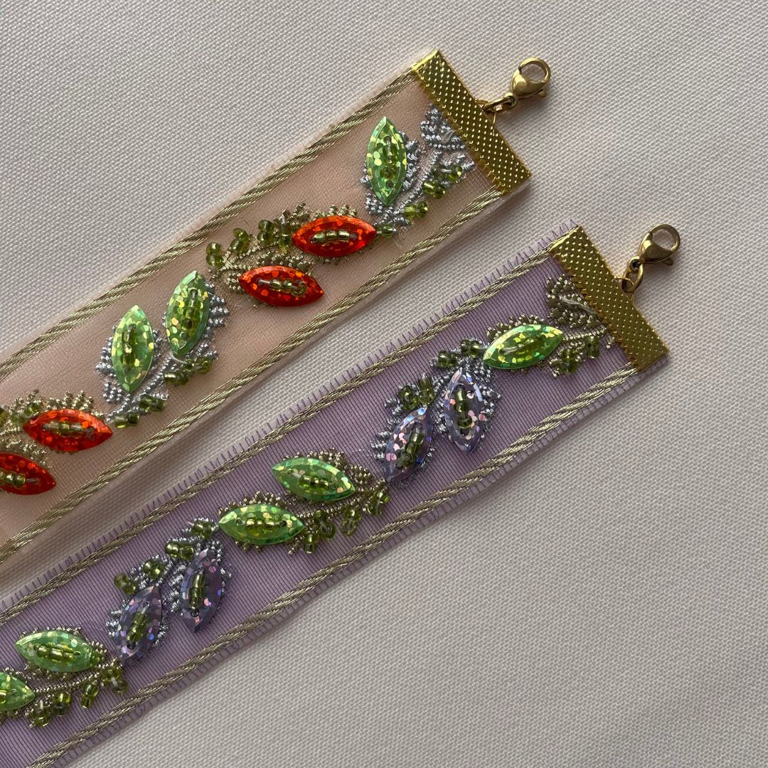 Inspirada na natureza e criada para brilhar, a Gargantilha de folhas com brilho destaca-se pela sua base têxtil transparente, decorada com uma bonita sequência de missangas em forma de folhas, bordadas à mão com detalhes que refletem a luz e acrescentam um toque único de cor e movimento.
